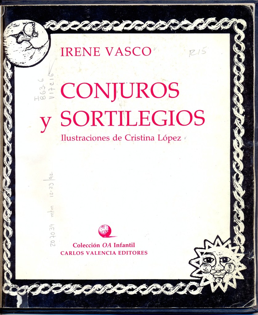 Conjuros y sortilegios (1990) fue un libro revelación que dio un nuevo aire a la poesía infantil colombiana. Su autora, Irene Vasco (Bogotá, 1952), quien estaba entregada a labores de promoción de lectura y era una firme activista de los derechos de los niños, de pronto aparecía con un divertidísimo manual profano de bruja lleno de fórmulas y recetas mágicas irreverentes, en descarada complicidad con los deseos secretos de los niños. Los veintitrés poemas, escritos la mayoría en verso libre, acuden a la rima y al ritmo provenientes de la jitanjáfora oral y de la décima castellana. El libro es una fiesta de la palabra, del retruécano, del juego de palabras que tanto encanta a los niños[15]. Los títulos ya anuncian los temas: “Poderoso sortilegio para desaparecer”, “Embrujo para convertirse en cualquier animal”, “Sortilegio para liberarse de la sopa”, “Hechizo para deshechizarse”. Probablemente el más famoso y recitado sea el “Sortilegio para que no haya colegio”, con su estribillo contagioso: “Que mañana no haya colegio. / Que mañana no haya colegio. / Que mañana no haya colegio… / Al decir este sortilegio, se cruzan los dedos índice y corazón de las dos manos. Es necesario concentrarse intensamente en las palabras mágicas. No siempre funciona”. El libro, editado por Carlos Valencia Editores, es una pieza hermosa y clave en la historia del diseño gráfico colombiano. Con su modesto trabajo a una tinta, las ilustraciones sugestivas y tenebrosas de Cristina López[16] y el cuidado en la diagramación particular de cada poema, se sentaba un precedente de calidad para los álbumes ilustrados.